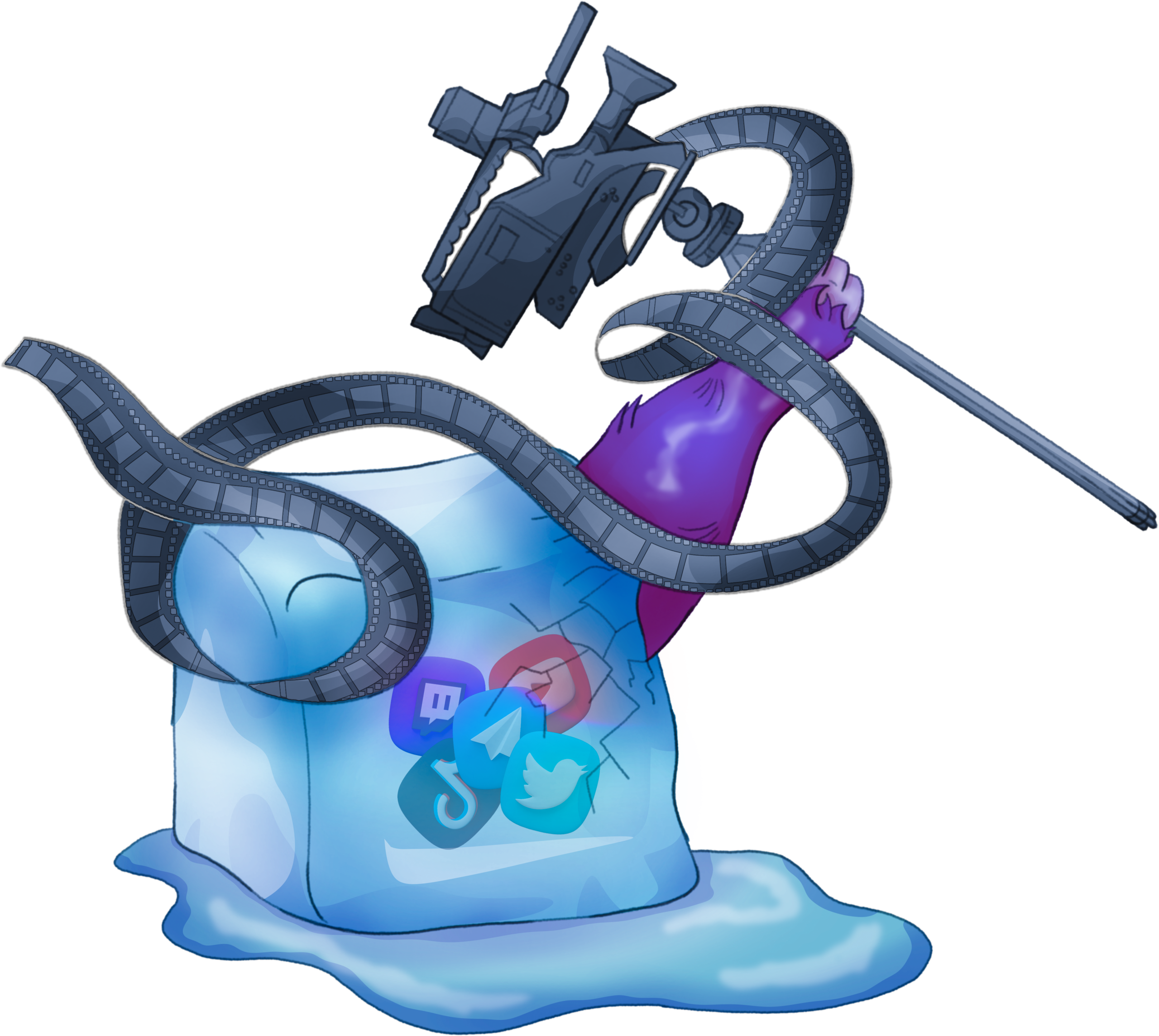 Unlock the ultimate creator potential within the SaaR ecosystem with the Influencer Pack. This visually stunning digital collectible features a melting blue ice block housing the icons of the world’s leading social platforms, including Twitch, YouTube, Telegram, TikTok, and Twitter. Emerging from the frozen core is a purple yeti arm wielding a professional cinema camera wrapped in cinematic film strips, symbolizing the powerful connection between the SaaR universe and the digital creator community.